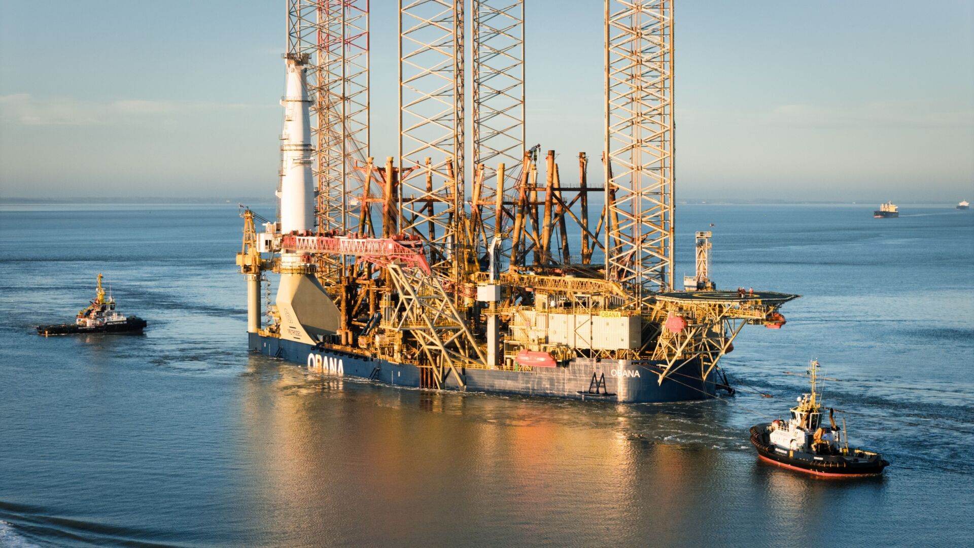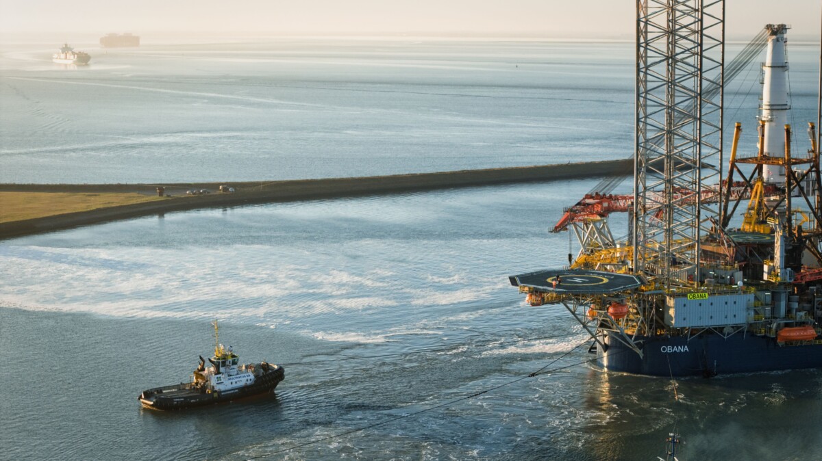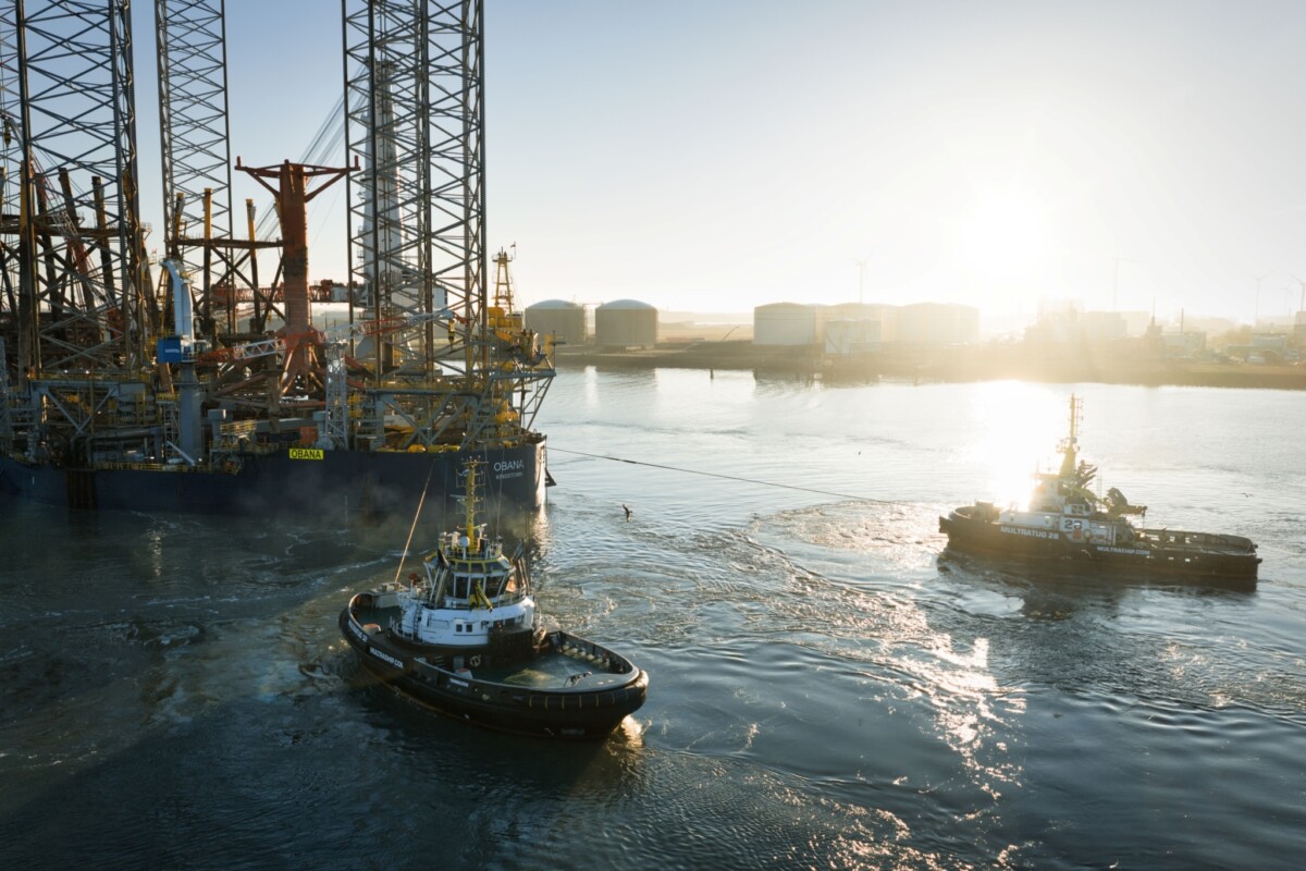 Recently, Multraship was involved in the arrival of OBANA in Flushing. OBANA is a newly delivered heavy‑lift jack‑up platform, purpose‑built for the decommissioning of offshore structures. The platform has been created by combining two former drilling rigs into a single six‑legged jack‑up unit, measuring 206 metres in length and 76 metres in width.