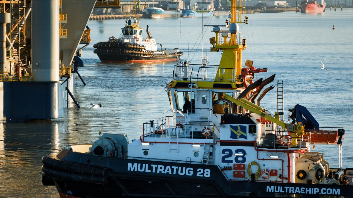 During the sea towage phase, MULTRATUG 29 joined OBANA while she was awaiting her allocated entry window into the port. From Westpit onwards, the operation was scaled up with the addition of MULTRATUG 28 and MULTRATUG 32. In total, six tugs were required to manoeuvre the platform in a controlled manner towards the quay.